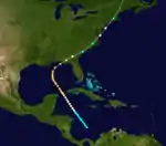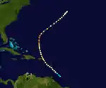 A tropical storm was first observed on August 30 near 14°N 38°W / 14°N 38°W, which is approximately 700 mi (1,125 km) west-southwest of Cape Verde.[1] The system slowed intensified while moving generally west-northwestward and then northwestward by September 1. Early on the following day, the storm strengthened into a hurricane. Around 18:00 UTC on September 3, the cyclone intensified into a Category 2 hurricane on the modern-day Saffir–Simpson scale and soon turned north-northwestward. The hurricane re-curved again by early on September 6 and reached Category 3 hurricane intensity later that day, peaking with winds of 115 mph (185 km/h).[2] Several steamships encountered the hurricane on September 8 and September 9, including the Othello, which observed a barometric pressure of 948 mbar (28.0 inHg),[1] the lowest known pressure in relation to the storm.[2] Additionally, the schooner Origin became caught in the storm, which damaged several parts of the ship and threw one person overboard, who drowned.[5] The hurricane weakened and lost tropical characteristics as it accelerated northeastward, transitioning into an extratropical cyclone about 500 mi (805 km) southeast of Greenland late on September 9.[2]