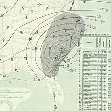 On September 18 a tropical storm was first observed and lasted until September 30. It formed to the east-southeast of the Lesser Antilles. It hit the Lesser Antilles and then the Greater Antilles, later curving north and striking near Punta Rassa, Florida, with winds up to 105 mph (169 km/h). It then went back out to sea and hit South Carolina, tracked through North Carolina, and then made its way out to sea, where it eventually dissipated. On September 20, as the storm passed through the Lesser Antilles, it produced heavy rains and high winds over several islands. On Martinique, high winds and continuous, torrential rains impacted the island. Despite the intensity of the storm, there were no reports of damage in the Lesser Antilles. In Hispaniola, more than 500 homes and two churches were destroyed; numerous other structures sustained damage, mainly having their roofs blown off. The cyclone produced heavy rainfall in Florida, including 13.78 inches (350.01 mm) over a 54-hour period at Tampa; at Titusville, 7.72 inches (196.09 mm) fell in two days. Jacksonville registered a storm total of 11.11 inches (282.19 mm).[6] In southeast Florida, a bridge on the Lake Worth Lagoon was swept away[7] and thousands of dead fish beached at Jupiter,[8] but otherwise only gale-force winds and occurred and damage was insignificant.[9] The ship Jella was stranded at Hillsboro Inlet and the Emily II sank off Key West with a loss of all her crew. Many wine caskets and other debris were found on the beaches between the New River and the Lake Worth Lagoon.[10] In all, the cyclone was responsible for an estimated 200 deaths.