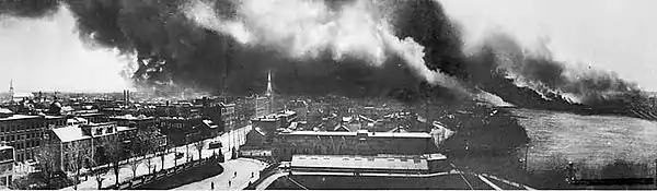Around 10 AM on April 26 a defective chimney on a house in Hull caught fire, which quickly spread between the wooden houses due to windy conditions.[1][2] Within two hours the blaze had destroyed several surrounding blocks. At that point it began to spread along the river, where there were large lumber companies on the banks and islands, and huge amounts of stacked lumber that quickly ignited.[2][3] By 1 PM the fire jumped the river on embers and set the Ottawa side ablaze.[2]