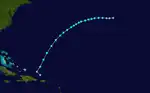 A tropical storm was first observed at 06:00 UTC on September 16, while located about 640 mi (1,030 km) southwest of Cape Verde, at the most southerly latitude of any North Atlantic tropical-storm-strength cyclone on record.[6] The storm headed west-northwestward for a few days and slowly strengthened. Late on September 19, it accelerated and began curving northwestward. At 00:00 UTC the next day, the storm strengthened into a Category 1 hurricane on the modern-day Saffir–Simpson hurricane wind scale. Later on September 20, the hurricane curved northward and then to the northeast. Further deepening occurred, with the storm becoming a Category 2 hurricane early the following day.[3]