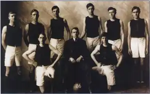 Gym manager and instructor Leo Hana, was put in charge of building the basketball program. The first University of Illinois Fighting Illini men's basketball team, led by its playing captain Roy Riley, beat Champaign High School January 6, 1906, two weeks before Hana was able to replace Riley with a “professional” coach.[1] Elwood Brown became Illinois’ first basketball coach January 20, 1906.[2] In the first season of Illinois basketball the Illini went 6-8, 3-6 in the Big Ten.