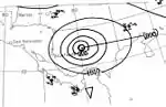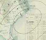 The final storm was first observed as a disturbance near Puerto Rico in the Caribbean Sea in late October.[17] The disturbance was the precursor to a tropical depression which developed over the southern Bahamas and headed west-southwestward across Cuba,[1] where, at Havana, winds blew from the southeast at 44 mph (71 km/h).[17] It became a tropical storm on October 27 and drifted southwestward. Near the eastern tip of the Yucatán Peninsula, the storm turned sharply northward.[1] An area of high pressure over the United States prevented the cyclone from turning eastward toward Florida, and it continued into the Gulf of Mexico. However, on October 31, the storm curved eastward and moved ashore over northern Florida. The storm decreased in intensity as it passed into the Atlantic.[17] The storm's circulation center remained poorly defined throughout its course. It was long believed to have developed south of Cuba, although a reevaluation of ship data indicated the depression had actually formed east of the island.[2] On October 26, the Weather Bureau hoisted hurricane warnings along the east coast of Florida from Key West to West Palm Beach, and on the west coast up to Tampa.[18]