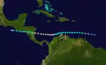 The next storm formed well to the east of the Lesser Antilles on September 3 and moved westward, attaining tropical storm status about a day later. The storm slowed and curved toward the southwest, nearing the northern coast of Colombia before pulling away from land and strengthening into a hurricane. It further intensified to Category 2 status before striking Nicaragua on September 10. Quickly weakening to a tropical storm, the cyclone continued westward across Central America and briefly entered the eastern Pacific Ocean. It dissipated shortly thereafter.[1] In the town of Corinto, a report indicated the deaths of 10 people and 50 additional injuries. About 250 houses were destroyed, leaving approximately $2 million (1911 USD, $62.8 million 2014 USD) in damage.[16] Data on this storm is extremely scarce; as such, only minor revisions could be made to its chronology in the hurricane database.[2]