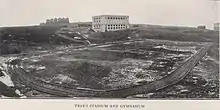 The Trees Stadium and Gymnasium were completed and put to use by the football team. Practice was held on the stadium grounds and the players utilized the locker room facilities in the adjacent Gymnasium. A "training house, where the regulars will be accommodated when the first squad was picked, was located on Dawson street." A freshman team was organized by Athletic Director Charles Miller.[15]