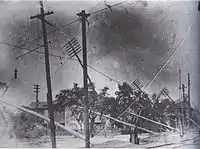 Upon making landfall, onshore anemometers documented winds stronger than had been recorded in any previous hurricane along the United States Gulf Coast. Gusts as high as 130 mph (210 km/h) were reported in New Orleans, with five-minute sustained winds peaking at 86 mph (138 km/h).[13] In Burrwood, Louisiana, a Weather Bureau anemometer documented peak five-minute sustained windspeeds of 122 mph (196 km/h), though when the abnormally high bias of the era's anemometers and adjustment to the more standard one-minute sustained measure are accounted for, this yields a speed of 99 mph (159 km/h).[1] The intense winds caused extensive damage across New Orleans, where nearly every building sustained damage.[13] The French Market was partly demolished, while the roof of a prominent Masonic temple partially collapsed.[15] Combined with powerful waves, the winds resulted in the sinking of four small steamers at the Port of New Orleans, in addition to several coal barges. A number of other steamers and small craft were blown from bayous and bays onto dry land.[13] The winds also caused widespread power outages, cutting telecommunications to and from the city,[16] and putting over 8000 telephones out of commission. Electric lighting was also disabled by the storm following the failure of city's power station.[15] Damage to city-owned property in New Orleans was appraised at nearly US$500,000, though the total amount of damage to all public and private property in the city was estimated to have been at least ten times greater at US$5 million. Damage to shipping along the Mississippi River in and around New Orleans was estimated at US$1.75 million.[13] Following the storm's passage, rail service to New Orleans was suspended.[15]