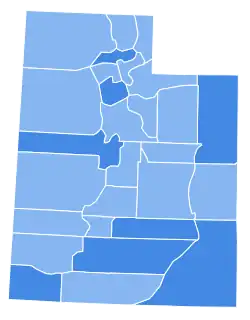 The combined result was that Wilson was able to make Utah his second-strongest victory outside of the "Solid South" – in a state that four years previously had given him his seventh-lowest popular vote proportion.[3] Utah was his eleventh-best state overall and voted 17.83 percentage points more Democratic than the nation at-large. Wilson swept every county in the state, including rock-ribbed Republican Kane County, which had been Taft's third-strongest county nationwide in 1912,[4] which has never otherwise supported a Democrat for president,[2] and where otherwise only William Jennings Bryan in 1896 and Franklin D. Roosevelt in 1936 have as Democrats received so much as one-third of the vote. This is the only time a Democrat swept every county in the state.