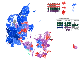 Of the 23 leveling seats, twenty (nine in the islands and eleven in Jutland) were allocated on a regional basis, and three (one in the islands and two in Jutland) were allocated based on the nationwide vote (including Copenhagen).[3] The allocation of candidates to leveling seats was based on a best-loser rule, using a form of Scorporo; in each single-member constituency a Hare quota of votes for the appropriate region was subtracted from the winner's votes and the remainders were pooled at a county level. The candidates with the highest proportion of the votes relative to the region's Hare quota were allocated the leveling seats.[3]