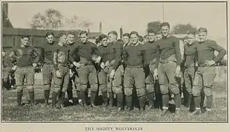 Several key players from the 1921 team were lost to graduation. These included halfback Eddie Usher, who played for the Green Bay Packers in 1922, and fullback Frank Steketee, who had been a first-team All-American as a freshman in 1918. Despite the loss of Usher and Steketee, the 1922 backfield was promising with Irwin Uteritz, Harry Kipke, Franklin Cappon, and Doug Roby all returning from the 1921 team. Michigan's biggest weakness going into the 1922 season was the center of its line. All-American center Ernie Vick graduated and joined the St. Louis Cardinals baseball team in June 1922.[3] Also gone were starting right guard, Hugh Wilson, and starting left guard, "Duke" Dunne.[4] The 1923 Michiganensian summed up the challenges facing the 1922 team, "When the football season of 1922 opened, Coach Yost was confronted with two big problems, to build a line strong enough to withstand the onslaught of opposing backs and to beat Ohio State."[5]