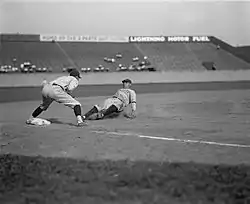 Senators third baseman Ossie Bluege looks on as New York Yankees outfielder Babe Ruth slidies into third base at Griffith Stadium in Washington, D.C., on June 23, 1925.