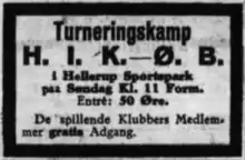- 1 2 3 4 Redaktør Vald. Hermansen (Politikens Hus, Raadhuspladsen) (31 May 1928). "Sport : Den store Sportsbegivenhed i Hellerup Sportspark paa Søndag – Vinder H. I. K. A-Rækken? Kampen, som enhver Ven af Idrætten i Hellerup bør se!". Villabyernes Blad (in Danish). No. 21. pp. 159–166. Retrieved 25 December 2017.