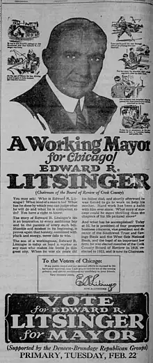 Edward R. Litsinger, who was chairman of the Cook County Board of Review and backed by reform-minded U.S. Senator Charles S. Deneen and Edward J. Brundage,[20][34] (the latter of whom had split from his political ally Robert E. Crowe by supporting Litsinger[35]), announced his platform on January 9.[34] He promised to compel the City Council to adopt an ordinance that would end the Chicago Traction Wars and consolidate all transportation lines under public ownership,[lower-alpha 3] to construct subways, to form a police investigation into the rampant crime, to look at causes of recent tax increases and investigate potential ways to reverse them, and to clean up streets and alleys.[34] He criticized Thompson as having been corrupt during his previous tenure as mayor.[21] In his campaign, Litsinger pledged "to be a working mayor for all Chicago." Litsinger placed the blame for the city's crime on Robert E. Crowe, the Thompson-aligned Cook County state's attorney.[33]