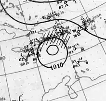 A westward-moving tropical wave developed into a tropical depression while situated near Tobago on August 7. Initially, the storm was considered a "disturbance of slight to moderate intensity". Moving northwestward, the system passed through the Windward Islands just south of Carriacou and Petite Martinique. Upon entering the Caribbean Sea early on August 8, a ship reported winds of 46 mph (74 km/h). As a result, HURDAT indicates that the depression became a tropical storm at 00:00 UTC. On August 9, the storm strengthened into a Category 1 hurricane on the modern-day Saffir–Simpson hurricane wind scale, while located about 155 mi (249 km) south of San Pedro de Macorís, Dominican Republic. At 12:00 UTC on August 10, the cyclone attained its peak intensity as strong Category 1 hurricane with maximum sustained winds with winds of 90 mph (140 km/h) and a minimum barometric pressure of 998 mbar (29.5 inHg). Early on August 9, the storm made landfall in the Tiburon Peninsula of Haiti, based on "belated reports [indicating] that a very small but destructive disturbance passed over extreme southwest Haiti". The quickly re-emerged into the Caribbean Sea later that day.[1]