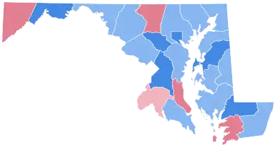 | Wicomico | 7,273 | 61.05% | 4,545 | 38.15% | 95 | 0.80% | 2,728 | 22.90% | 11,913 |