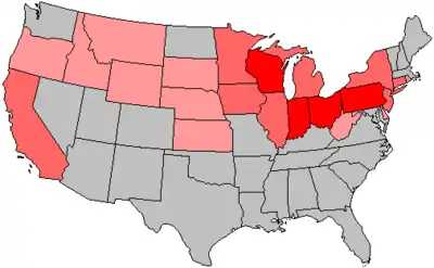 Meanwhile, the Republicans were united; they had shed their weakest members in a series of defeats since 1930.[3] Re-energized Republicans focused attention on strong fresh candidates in major states, especially Robert A. Taft, the conservative from Ohio,[4] Earl Warren, the moderate who won both the Republican and the Democratic primaries in California,[5] and Thomas Dewey, the crusading prosecutor from New York.[6] The Republican resurgence in 1938 was made possible by carrying 50% of the vote outside the South, giving GOP leaders confidence it had a strong base for the 1940 presidential election.[7]