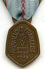 The 1939–1945 Commemorative war medal (French: "Médaille commémorative de la guerre 1939–1945") is a commemorative medal of France established on 21 May 1946 to recognize individual participation in the Second World War.[1]
