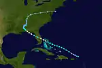 On August 7, a tropical storm formed north of the Leeward Islands, likely from a tropical wave.[4] It tracked to the west-northwest, slowly strengthening to a hurricane as it moved through the Bahamas on August 11. Later that day, it struck the east coast of Florida near Stuart, and crossed the state in around 15 hours.[7] After weakening to a tropical storm, it quickly re-strengthened upon emerging into the Gulf of Mexico, and made another landfall near Apalachicola, Florida, on August 13. Over land, the cyclone slowed considerably and quickly deteriorated.[5] By August 14, the storm had weakened to a tropical depression as it drifted through Alabama. The depression turned to the northeast, and remained a tropical depression until it dissipated just offshore New Jersey on August 20.[4] Due to timely reports and warnings, the storm was reportedly forecast with "exceptional accuracy".[5]
