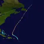 On the afternoon of October 9, reports from the Leeward Islands of low pressures and unsettled weather indicated that a storm was forming in the vicinity.[4] The disturbance strengthened into a tropical storm on October 12 to the northeast of Puerto Rico. The quickly escalating storm tracked northwestward before turning towards the northeast, away from a high pressure area building in from the west.[5] Early on October 15, the storm attained hurricane intensity and continued to mature until October 16, when it reached its peak at a strength corresponding to Category 4 status on the modern-day Saffir-Simpson Hurricane Scale.[4] That same day it passed just east of Bermuda. It weakened as it accelerated to the northeast, and became extratropical near Newfoundland a couple of days later.[4][5]