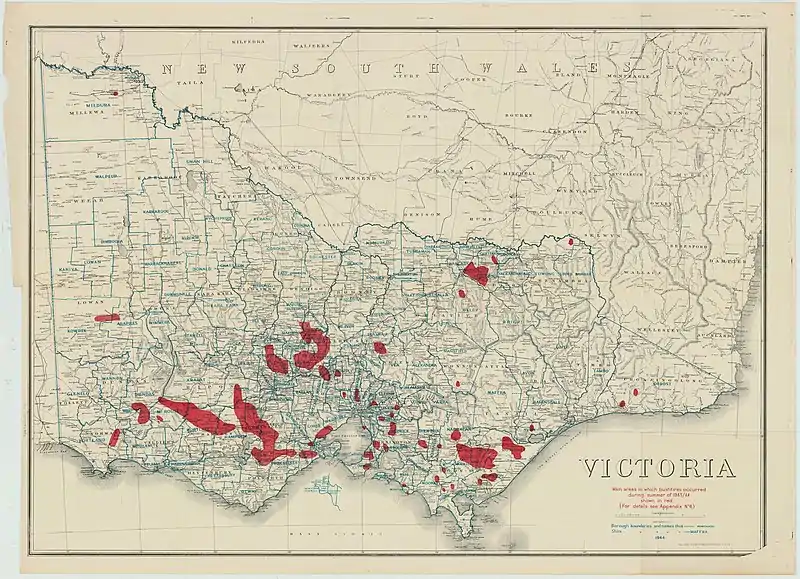 A series of major bushfires following severe drought conditions in the state of Victoria in Australia, occurred during the summer of 1943–44. It was the driest summer ever recorded in Melbourne until 2002 with just 46 millimetres or 1.81 inches falling, a third of the long-term average.[1] Between 22 December 1943 and 15 February 1944, burnt an estimated one million ha,[2] 51 people were killed, 700 injured, and 650 buildings were destroyed across the state.[3] Many personnel who would have been normally available for fire fighting duties had been posted overseas and to remote areas of Australia during World War II.[1]