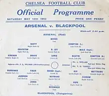 The 1943 Football League War Cup final was an association football match contested by Arsenal and Blackpool. The match was held at Chelsea's home stadium Stamford Bridge on 15 May 1943, with Blackpool winning 4–2. According to British sportswriter Jon Henderson, it was "widely regarded as the greatest club match" of World War II.