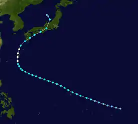 Louise was first seen developing on October 2, 1945, in the Caroline Islands. It unexpectedly veered north and slowed down, only to intensify as it passed over Okinawa on October 9 with 90 mph wind gusts and a minimum central pressure of 968.5 mbar. Shortly after, Louise began to weaken, and hit Japan as a strong tropical storm. The tropical cyclone became extratropical shortly after on October 12. In Okinawa, 36 people died, 47 people were reported missing, and 100 people were seriously injured.