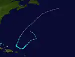 Hurricane Easy, the strongest tropical cyclone of the season, was a powerful and long-lived Cape Verde-type hurricane that originated as a tropical depression on September 1 between the Lesser Antilles and Cape Verde.[8] Moving generally west-northwestward, the depression deepened into a tropical storm late that day, and further to hurricane status by September 3. On September 5, the cyclone reached its first peak of 110 mph (177 km/h), but failed to continue strengthening. Its winds fluctuated through the early morning on September 6, but then resumed strengthening, reaching major hurricane status by that evening.[8] During this period, Hurricane Hunters flew into the hurricane to monitor its progress, recording a minimum pressure of 957 millibars (28.26 inHg) on September 6 to the north of the Lesser Antilles.[5] The next day, an aircraft was unable to penetrate the center, estimating winds of 160 mph (257 km/h) south of the eye. On this basis, Easy was once classified as a Category 5 hurricane on the Saffir-Simpson scale;[22] A reanalysis in 2015 lowered the peak winds to 150 mph (240 km/h) on September 8. This was based on the Hurricane Hunters reporting a pressure of 937 mb (27.67 inHg) on the previous day, and a ship reporting winds of 140 mph (230 km/h).[22] By the time Easy attained peak intensity, it had turned to the north and northeast while beginning a steady weakening trend.[5][8] It interacted with the small Hurricane Fox to the east; this was the first observed instance of a hurricane affecting another's path.[5][23] Easy then turned to the northeast, passing a short distance southeast of Bermuda on September 9 with winds of 110 mph (177 km/h).[8] Easy evolved into an extratropical cyclone late on September 11, while still maintaining hurricane-force winds. The remnants lost their hurricane-force winds on September 12, only to briefly regain them two days later. On September 14, Easy lost its identity over the northern Atlantic Ocean after it was absorbed by another extratropical storm to the north.[22]