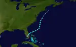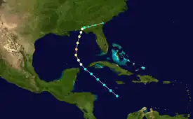 On August 29, a tropical storm developed over southern Florida.[8] While moving through the state, the storm dropped heavy rainfall, reaching 4.67 in (119 mm) at Fort Lauderdale Beach; similar rainfall was observed in the northern Bahamas. Described by one Weather Bureau forecaster as "wide and flat", the storm gradually organized over the western Atlantic Ocean.[20] On August 31, the storm turned to the northwest, with maximum sustained winds of 40 mph (65 km/h). The system weakened to a tropical depression before moving ashore near Savannah, Georgia on September 1. It dissipated that day over land.[8]