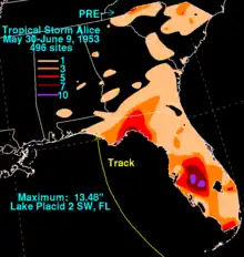 - ↑ Staff Writer (1953-06-03). "Storm 'Alice' Fizzles in Gulf". Palm Beach Post. Retrieved 2010-01-05.