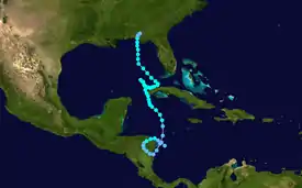 A tropical storm developed east of Nicaragua on May 25, executing a counterclockwise loop over Central America. After weakening over land, Alice re-intensified over the western Caribbean, moving over western Cuba on May 21 with winds of 50 mph (80 km/h). On June 1, it entered the Gulf of Mexico, and later executed another loop off the northwest coast of Cuba.[3] Alice quickly weakened due to a cold front,[4] and advisories were discontinued by June 3.[5] While near Cuba, Alice produced drought-breaking rainfall that caused flooding and several unofficial drowning deaths.[3]