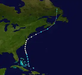 On August 28, a tropical wave developed into a tropical depression near Cape Verde. After moving west-southwestward, it turned to the northwest, intensifying into a tropical storm on August 31 and into a hurricane on September 2. Passing northeast of the Lesser Antilles, Carol rapidly intensified to Category 5 intensity, reaching peak winds of 160 mph (260 km/h) on September 3, making it the strongest hurricane of the season.[3][8] It gradually weakened, bypassing Bermuda on September 6 and producing high waves.[8][16] Carol later turned to the north-northeast, brushing Cape Cod and causing boating accidents across New England. Four people were killed in the region.[8][17] Fishing losses totaled around $1 million (1953 USD, $10.9 million 2023 USD).[3]
