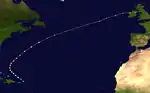 Shortly behind Dolly, another tropical wave spawned a tropical depression over the Lesser Antilles on September 15.[3] As it moved through the region, it produced unsettled conditions across the northeast Caribbean.[24] Edna quickly intensified as it tracked northwestward, attaining hurricane status on September 15 and peak winds of 115 mph (185 km/h) the next day. After peaking, the hurricane turned to the northeast and maintained most of its intensity for a few days.[3] It passed just north of Bermuda early on September 18 with winds of 115 mph (185 km/h), before beginning a steady weakening trend as it accelerated. By September 19, Edna completed the transition into an extratropical cyclone, lasting another day before dissipating west of Ireland.[8]
