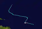 A tropical storm developed from a dissipating cold front on November 23, about 460 mi (740 km) northeast of Barbuda in the Lesser Antilles. It moved northeastward, strengthening to peak winds of 50 mph (85 km/h) on November 24. It later turned sharply to the west as it began a weakening trend, followed by a curve to the north. The cyclone dissipated on November 26 about 450 mi (725 km) east-northeast of Bermuda, without ever affecting land.[8]