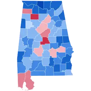 As of the 2020 presidential election, this is the last election in which Macon County voted for a Republican nominee, and the only election since Reconstruction that this majority-black county has voted Republican.[lower-alpha 3] It is also the last time that Houston County voted for a Democratic nominee,[25] and the last time that the state has supported a losing Democratic nominee or that a Republican won two terms without ever carrying the state.