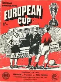 The 1960 European Cup final was the fifth final in the history of the European Cup, and was contested by Real Madrid of Spain and Eintracht Frankfurt of West Germany.[2] Real won 7–3 in front of a crowd of over 127,000 people at Glasgow's Hampden Park stadium, still the highest attendance for a European Cup final. There were an estimated 70 million television viewers around Europe. Widely regarded as one of the greatest football matches ever played,[3] it also remains the highest-scoring final in the history of the competition.[4]