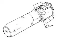 After the weapon had fallen a required vertical distance, the differential pressure switch would close contacts which passed battery current through the MC-772 Arm/Safe Switch and from there to the MC-788 High Voltage Safing System, which is armed by continual current being applied to it.[15] Upon receiving this current, the MC-788 would then connect the (not yet-charged) high-voltage thermal battery to the X-Unit, the electrical device that provides a high voltage signal to the detonators used in the "primary" stage of the weapon.[16] After the timing circuit completed its countdown of 42 seconds, it would then deliver initiation power to the MC-641 High Voltage Thermal Battery pack. This would begin to generate its full voltage of 2500 volts within 1-2 seconds, which would be applied directly to the trigger circuit and, through the MC-788 High Voltage Safing System, to the capacitor bank of the X-Unit. Once the bomb impacted the ground, a crush switch on the nose of the bomb would be closed and trigger the X-Unit to discharge its capacitors and initiate the high-explosive system in the "primary" stage of the weapon.[12][17]