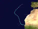 A tropical disturbance emerged from Africa in late August and developed into a weak tropical depression on August 27. For about 30 hours, the system affected the Cape Verde islands with rainfall, during which it moved slowly to the west and west-northwest. Late on August 28, it was estimated that the depression intensified into a tropical storm. The next day, satellite imagery observed a well-developed tropical cyclone in the far eastern Atlantic Ocean. In addition, a ship reported winds of force 9 on the Beaufort scale, suggesting winds of 50 mph (80 km/h). On that basis, the Weather Bureau initiated advisories on Tropical Storm Becky, despite the agency only issuing advisories for storms west of 35° W. Around that time, the storm moved over an area of anomalously warm water temperatures, which allowed for its intensification. On August 30, Becky turned to the north and northeast due to an approaching trough, becoming the easternmost cyclone since 1886 that a storm began a motion to the north. A hurricane hunters flight on August 31 indicated that Becky became extratropical about 70 mi (115 km) south of Santa Maria Island in the Azores. The storm's remnants continued to the northeast, dissipating on September 1 about 320 mi (515 km) west of Spain.[3][10]