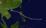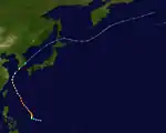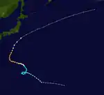Tropical Storm Rose began as a tropical depression in the South China Sea on June 6, and tracked southeastward towards Luzon in its early stages.[18] On June 8, the JTWC began issuing warnings on Rose as a tropical storm while the cyclone was just off Luzon's northwestern coast.[6][19] Slow strengthening continued thereafter, with Rose's peaking as a 95 km/h (60 mph) tropical storm as it was tracking across the Ryukyu Islands,[19] though the storm's strongest winds were contained within a narrow rainband near the center.[6] Moving rapidly northeastward, Rose passed over western Honshu as a lower-end tropical storm on June 13,[19] briefly emerging into the Sea of Japan before recurving eastward and transitioning into an extratropical cyclone over northern Honshu on June 14.[18] The remnants of Rose merged with another weak extratropical low off the Japanese coast, and this combined system continued eastward before dissipating over the Bering Sea on June 18.[6]