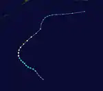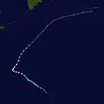 The low-pressure area that eventually developed into Typhoon Olive first formed approximately 155 km (96 mi) southeast of Truk on April 21,[6] embedded within the larger context of a trough.[2] In its nascent stages, the disturbance tracked slowly west-northwestward toward Woleai; the Japan Meteorological Agency (JMA) considers the storm to have developed into a tropical depression on April 26,[7] though the JTWC began monitoring Olive as a 75 km/h (45 mph) tropical storm the day after.[8] Olive quickly intensified following tropical cyclogenesis, becoming a typhoon by 12:00 UTC on April 27.[8] Late on April 28, a reconnaissance mission sampled winds of 230 km/h (145 mph) and a minimum barometric pressure of 932 mbar (hPa; 27.52 inHg);[2] from these parameters Olive reached peak intensity at 00:00 UTC on April 29 with a minimum pressure of 920 mbar as computed by the JMA.[7] Olive passed near Guam and Saipan later that day, impacting the latter with winds of 205 km/h (125 mph).[6] As the typhoon receded to more northerly latitudes, it slowly weakened, transitioning into an extratropical cyclone on May 5 before dissipating four days later;[7] maintaining typhoon strength for 8.5 days, Olive remained a typhoon longer than any other storm in 1963.[6]