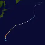 Polly originated from an area of low pressure first detected 145 km (90 mi) north-northwest of Woleai on May 25.[6] The JMA determined that the disturbance developed into a tropical depression on May 27,[14] though the JTWC initiated warnings on the system on May 31.[6] The cyclone gradually strengthened after formation, reaching tropical storm strength on June 1 and typhoon intensity the day after.[14] On June 3, Polly reached peak intensity with sustained winds of 130 km/h (80 mph) and a minimum pressure of 978 mbar (hPa; 28.88 inHg),[15] after which it began to slowly taper off in strength and accelerate northeastward. On June 5, Polly passed 190 km (120 mi) southeast of Tokyo as a low-end typhoon before recurving towards the east-northeast.[6][16] The extratropical remnants of Polly reached the Bering Sea and the coast of Alaska on June 10 before dissipating.[16]