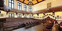 As is traditional at the Cambridge Union, an institution described as 'the world's oldest and most prestigious debating society',[3] the debate took place on a Thursday evening after dinner. An over-capacity crowd of more than 700 students and guests of the Union were packed into the debating chamber, which is modelled after the British House of Commons. A further 500 additional people filled the other rooms on the Union premises, which received a live broadcast organised by the B.B.C.