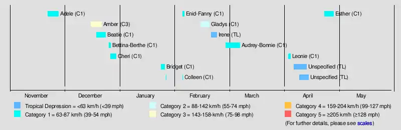 | Audrey-Bonnie | 1–9 Mar | Category 2 tropical cyclone | 110 (70) | 975 | Western Australia, Northern Territory | Unknown | Unknown | |