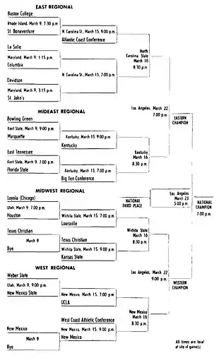 | Mideast | Marquette | Al McGuire | Independent | Regional third place | East Tennessee State | W 69–57 |