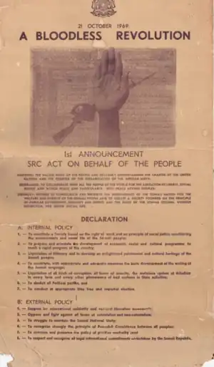 Arising out of the highly contested parliamentary elections of March 1969 and political tensions, the coup led to political repression and Somalia becoming a virtual Soviet satellite state until 1977 at which point it became an ally of the United States.[2] It was the first successful coup, after two previous aborted attempts, in Somali history since the country achieved independence nine years earlier in 1960.