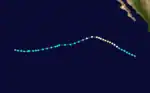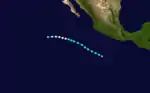 Katherine became a tropical storm on September 29, just six hours after forming. It headed out to sea. On October 1, it became a Category 2 hurricane. It peaked in windspeed the next day. After weakening to storm strength, it crossed 140°W and entered the central Pacific.[2] Katherine continued its slightly south of westward track. It dropped to a depression on October 9, and dissipated shortly after that due to the influence of a cold trough[2][7]