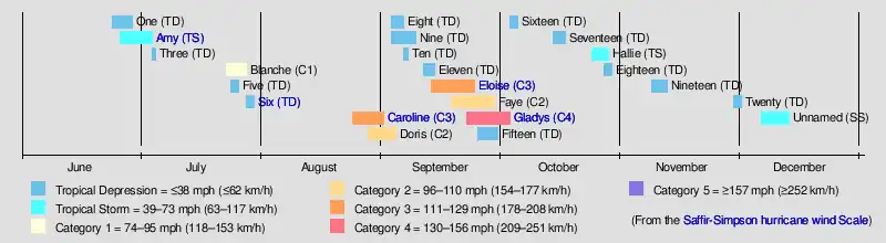 Tropical cyclogenesis began in June, with the development of a tropical depression on June 24, followed by Tropical Storm Amy on June 27. Four systems originated in July, including Hurricane Blanche. After Tropical Depression Six dissipated on July 30, tropical activity went dormant for over three weeks, ending with the development of Hurricane Caroline on August 24. Another cyclone, Hurricane Doris, also formed in August. September was the most active month of the season, featuring eight tropical cyclones, including hurricanes Eloise, Faye, and Gladys. In October, four systems formed, one of which intensified into Tropical Storm Hallie. Two tropical depressions developed in November. The last system, a subtropical storm, formed on December 6 and transitioned into an extratropical cyclone on December 13.[3]