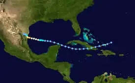 A tropical wave that emerged into the Atlantic from the west coast of Africa on August 15 developed into a tropical depression about 200 mi (320 km) north of Hispaniola on August 24.[3][7] The depression moved west-southwestward and failed to intensify before crossing the Turks and Caicos Islands and making landfall along the northern coast in eastern Cuba on August 25. After emerging into the Caribbean Sea, the cyclone headed west-northwestward beginning on August 27. By the following day, the depression entered into the Gulf of Mexico after passing just offshore the Yucatán Peninsula. The system then intensified into Tropical Storm Caroline early on August 29 and hurricane by 00:00 UTC the following day. Further strengthening occurred, with the storm peaking as a Category 3 hurricane with winds of 115 mph (185 km/h) and a minimum pressure of 963 mbar (28.4 inHg) early on August 31. Around that time, Caroline made landfall in a rural area of Tamaulipas, located in northeastern Mexico. The system rapidly weakened and dissipated on September 1.[3]