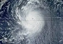Doris made meteorological history when, on August 31, it became the first Atlantic hurricane ever to be upgraded to hurricane intensity solely on the basis of satellite pictures,[1] via the Dvorak technique.[7] The cyclone then curved northward and intensified further during the next few days, becoming a Category 2 hurricane early on September 2.[3] Based on the Dvorak technique, it is estimated that Doris peaked with maximum sustained winds of 110 mph (180 km/h) and a minimum barometric pressure of 965 mbar (28.5 inHg) shortly thereafter. By September 3, the hurricane began interacting with a non-tropical low pressure area.[7] On the following day, Doris quickly weakened to a tropical storm and transitioned into an extratropical cyclone about 830 mi (1,340 km) south-southeast of Cape Race, Newfoundland, around 06:00 UTC. The extratropical remnants weakened and then dissipated late on September 4.[3]