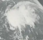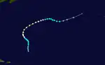 On August 11, a cold-core low was located south of Bermuda. Over the next week, the system warmed and moved toward the surface.[34] Around 12:00 UTC on August 18, the low developed into a tropical depression about 200 mi (320 km) west-southwest of the island,[2] after satellite imagery showed better organization and a ship reporting winds gusting to 46 mph (74 km/h).[34] Moving fairly quickly to the north-northeast, the depression intensified into Tropical Storm Candice about six hours later. Candice curved east-northeastward early on August 20 and weakened slightly, before re-strengthening later that day. By 06:00 UTC on August 20, the cyclone intensified into a hurricane.[2] Becoming a hurricane at 41.2°N, Candice was one of few Atlantic tropical storms to intensify into a hurricane while situated north of 40°N.[35] Around that time, Candice had decelerated and briefly turned to the southeast, before pivoting northeastward on August 21. Candice continued to intensify, peaking with sustained winds of 90 mph (150 km/h) and a minimum pressure of 964 mbar (28.5 inHg) later on the following day.[2] The hurricane then accelerated due to an approaching cold front, before merging with the front about 475 mi (765 km) east of Newfoundland at 12:00 UTC on August 24.[2][34]