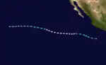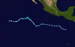 Late on August 23, an area of disturbed weather developed about 485 miles (781 km) south of Acapulco, Guerrero.[2] It rapidly coalesced into a tropical depression around 00:00 UTC the next day, but only slowly strengthened into Tropical Storm Iva by 18:00 UTC on August 25.[3] The system moved west and then west-northwest, further developing into a hurricane by 18:00 UTC on August 26 as a small eye became distinct.[2] Iva attained major hurricane strength late on August 27, further intensifying to its peak as a Category 4 hurricane with winds of 130 mph (210 km/h) around 06:00 UTC the following morning.[3] It oscillated in strength over the subsequent 24 hours, but ultimately began a steady weakening trend by August 30 while passing over marginal ocean temperatures.[2] Iva fell to tropical storm strength early that day, weakened to a tropical depression early on September 1, and dissipated around 00:00 UTC on September 2.[3]