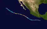 A tropical disturbance was first noted about 345 miles (555 km) south of the Guatemalan coastline on September 27.[2] It organized into Tropical Storm Madeline by 00:00 UTC on September 29 but failed to further develop, instead weakening to a tropical depression the next morning. By 00:00 UTC on October 4, Madeline re-intensified into a tropical storm, beginning a gradual curve toward the north as well. The system continued to strengthen and became a hurricane early on October 6; by 06:00 UTC on October 8, Madline peaked as a Category 4 hurricane with winds of 145 mph (233 km/h). It moved onshore the coastline of Mexico a few hours later, rapidly weakening and losing its status as a tropical cyclone after 18:00 UTC that day.[3]
