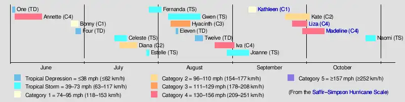 This season had a slightly below average number of tropical storms, with fourteen. The number of hurricanes was average, with eight. The season had an above-average number of major hurricanes, with five reaching Category 3 or higher on the Saffir-Simpson Hurricane Scale. Four of tropical depressions dissipated before they could reach tropical storm strength. There were five landfalls, including three by consecutive storms. In the Central Pacific, one tropical cyclone, a hurricane formed. Two storms entered the region from the east. These totals are close to average.[1]